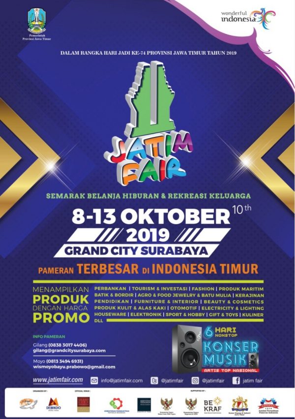 Pameran Jatim 2019 ini adalah pameran terbesar di Indonesia timur yang menampilkan Produk perbankan, Tourism dan investasi, Produk martihm batik & bordir, Agro & food jewelr & batu mulia, Kerajinan pendidikan, Interior & Furniture, Electricity & Lighting houseware, Electronic dan lain-lain dengan harga promo yang menarik yang bisa kamu nikmati di Grand city Surabaya.
