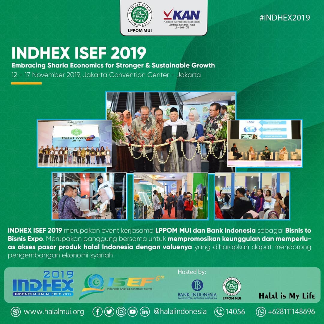 INDHEX ISEF 2019 merupakan event kerjasama LPPOM MUI dan Bank Indonesia sebagai Bisnis to Bisnis Expo. Merupakan panggung bersama untuk mempromosikan keunggulan dan memperluas akses pasar produk halal Indonesia dengan valuenya yang diharapkan dapat mendorong pengembangan ekonomi syariah.