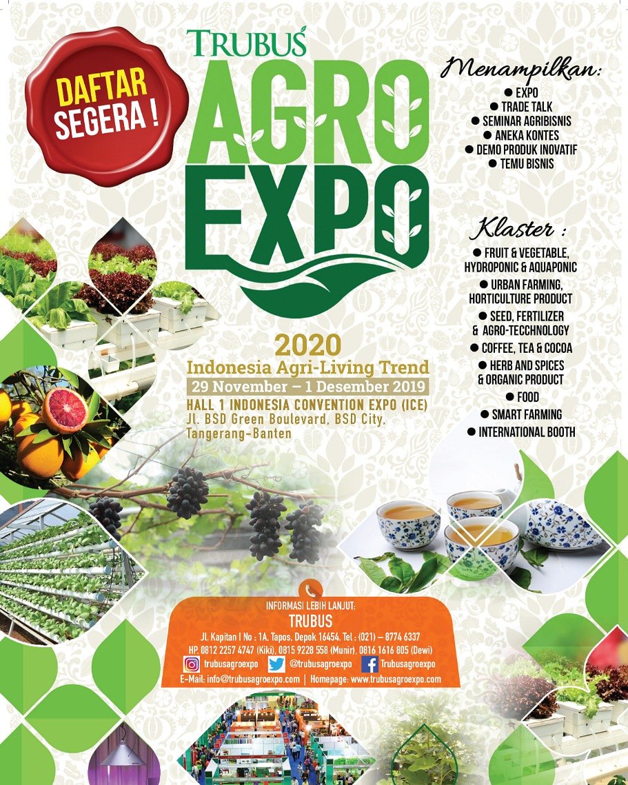 Trubus Agro Expo 2019 merupakan Tren Agri-Living 2020. Di Trubus Agro Expo anda akan menemukan berbagai produk pertanian, dimana anda dapat berinteraksi langsung dan belajar tentang banyak hal!