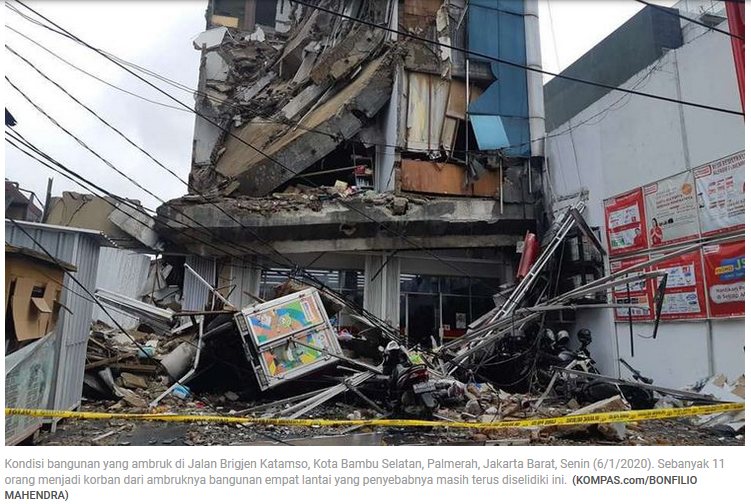 RUNTUHNYA bangunan gedung 5 lantai di Slipi, Jakarta Barat, pada Senin (6/1/2020) pukul 09.15 WIB, menggambarkan sebagian dari potret wajah konstruksi di Jakarta. Ini merupakan kasus kegagalan bangunan gedung dengan ketinggian menengah (mid rise building), selain kasus sejumlah bangunan gedung tinggi (high rise building) lainnya.
