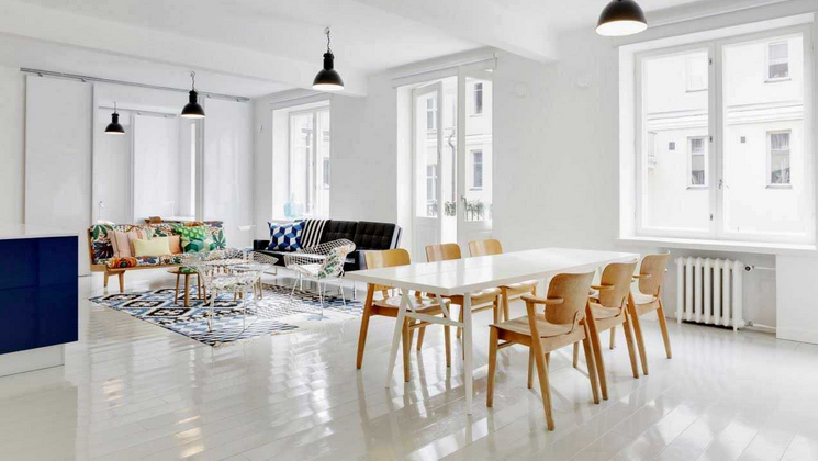 Sebuah cara yang sangat klasik untuk mengerjakan lis adalah mengecatnya dengan warna cat putih salju mengkilap. Corak putih salju juga terlihat pada furnitur dan kusen pintu dan jendela, yang mempertegas ruang dan menciptakan tampilan yang harmonis.