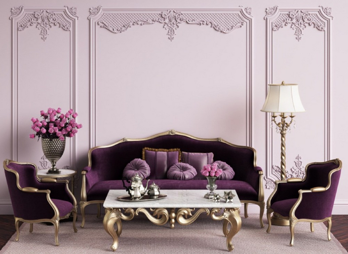 Sementara, furniturnya menggunakan sofa berwarna ungu tua yang dipadukan dengan bantal-bantal mungil berwarna ungu yang sedikit lebih muda. Sebagai tambahan aksen pada interior warna monokrom ungu ini, beri sentuhan warna emas pada kerangka furnitur yang efektif dapat membuat ruangan terkesan lebih mewah. Untuk dekorasinya, pilihlah model bunga klasik yang juga berwarna ungu.
