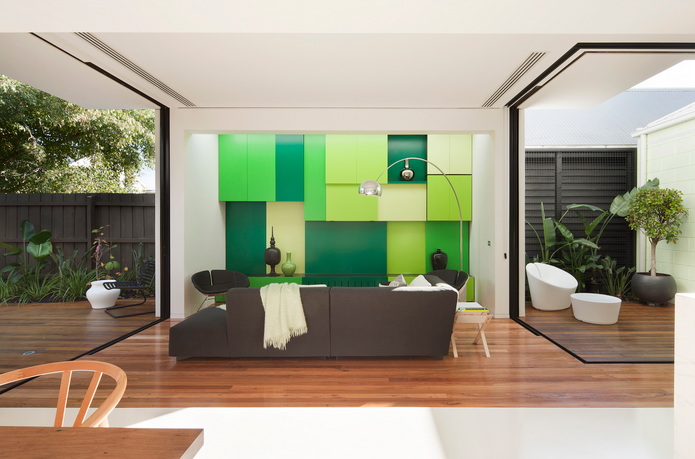Pada satu bidang dinding terdapat susunan balok modular dengan ukuran yang berbeda-beda. Setidaknya ada empat turunan warna monokrom hijau yang dirangkai secara acak. Tanpa banyak dekorasi, dinding monokrom hijau ini sudah terlihat indah dan sangat unik.