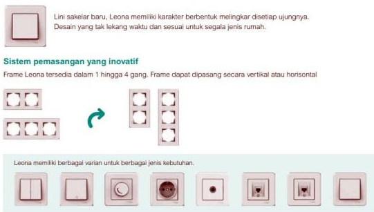 Desain saklar dan stop kontak Leona memiliki berbagai varian untuk berbagai jenis kebutuhan. Jadi sangat bisa 'nyambung' dengan segala desain ruangan rumah. Leona mempunyai contact point yang berkualitas tinggi untuk mereduksi panas, serta kabel yang andal dan tahan lama.