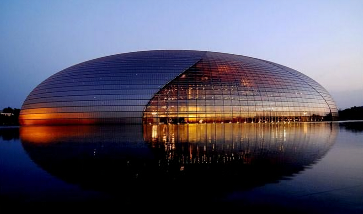 The National Grand Theatre, yang juga dikenal sebagai Beijing National Center for the Performing Arts (国家大剧院), dikelilingi danau buatan, di sebelah barat Lapangan Tiananmen. Bentuk menyerupai telur dari kaca dan titanium, karya Paul Andreu arsitek dari Perancis. Luas total 356 meter persegi dan ketinggian 46 meter. Pintu masuk berupa lorong di bawah danau. Dijuluki “The egg of Water” (sumber : english.cntv.cn)