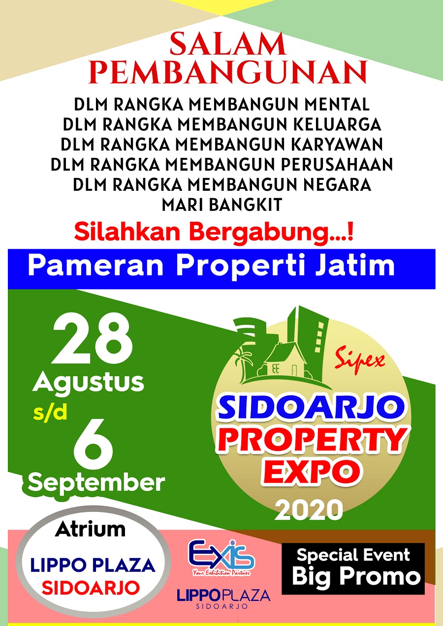 Dalam rangka memasuki era new normal 2020 ini, Exindo Mitranusa akan kembali menggelar Pameran Properti Jatim dengan tema SIDOARJO PROPERTY EXPO 2020 (SPESIAL EVENT) pada tanggal 28 Agustus-6 September 2020 di Lippo Plaza Sidoarjo. Pameran kali ini tentu sangat menguntungkan para investor properti dan user, karena semua pengembang akan memberikan kemudahan-kemudahan dan bonus spesial.