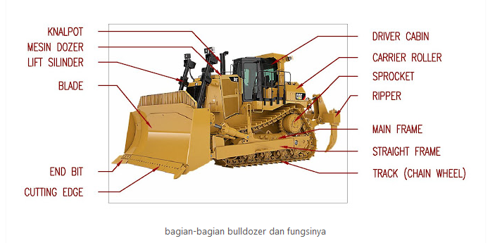 Selanjutnya, berikut ini merupakan rincian lebih lanjut mengenai bagian-bagian bulldozer dan masing-masing fungsinya.