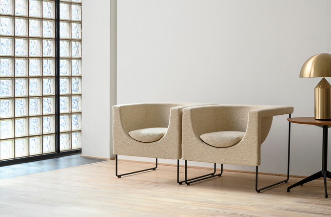 Berikutnya, ada model armchair yang dibuat dengan desain minimalis, di mana bagian kaki atau penopangnya terbuat dari besi tipis warna hitam yang tegas. Sementara, bagian dudukan armchair ini didesain melengkung ke dalam dan terbuat dari bahan kain warna krem yang lembut. Tak lupa, ada juga bantalan atau alas duduk empuk yang akan membuat kamu merasa lebih nyaman dan betah duduk berlama-lama.