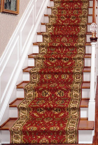 Dengan menempatkan karpet yang cerah dan elegan di sepanjang tengah tangga