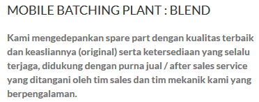 Berdiri sejak 1 Februari 2013, INTI JAYA INDUSTRI merupakan Sister Company Farrasindo Group.Bergerak dan fokus dalam bidang CONCRETE MACHINERY SPARE PARTS & SERVICE. Inti Jaya Industri sebagai Supporting Farrasindo Group terhadap dukungan layanan sarana purna jualAfter Sales Serviceuntuk penjualan unit - unit CONCRETE MACHINERY antara lain : STATIC BATCHING PLANT REAL MOBILE BATCHING PLANT CONCRETE MIXER BATCH PUMP TRUCK CONCRETE PUMP MOLI CONCRETE PUMP STATIONARY PUMP CONCRETE PLACING BOOM ALAT-ALAT TEST LABORATORIUM BETON serta Accesories concrete machinery lainnya Dengan items suku cadang spare parts yang lebih lengkap, berkualitas serta ketersediaan stock yang terjaga dengan baik. Serta para tenaga ahli di bidang CONCRETE MACHINERY untuk pelayanan perbaikan service dan repair. KAMI HADIR SEBAGAI PARTNER YANG DAPAT DIANDALKAN DAN TERPERCAYA. 图片展示
