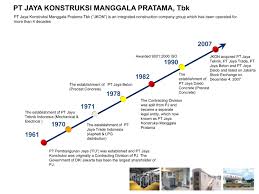 PT Jaya Konstruksi Manggala Pratama, Tbk., sebagai bagian dari Grup Jaya, merupakan perusahaan infrastruktur yang terintegrasi dengan kompetensi inti dalam sektor infrastruktur dan sector konstruksi bangunan, perdagangan aspal dan bahan bakar gas cair (LPG), pabrikasi beton pracetak dan pekerjaan mekanikal dan elektrikal serta jasa pemeliharaan. Pada awalnya, Perseroan merupakan Divisi Kontraktor di PT Pembangunan Jaya, yang kemudian menjadi badan hukum tersendiri pada 23 Desember 1982 dan mencatatkan sahamnya di Bursa Efek Indonesia (BEI) pada Desember 2007.