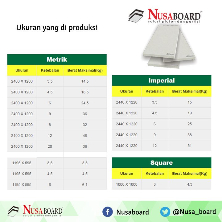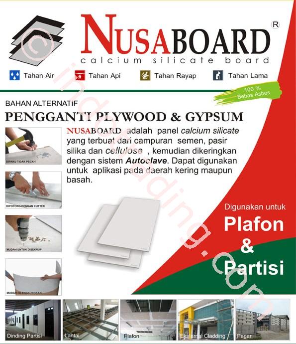 NUSABOARD adalah lembaran rata kalsium silikat yang diproduksi oleh PT. Nusantara Building Industries sejak tahun 2006. Dibuat dari bahan baku pilihan yang berkualitas tinggi dan ramah lingkungan.NUSABOARD diproduksi dengan menerapkan teknologi Autoclave sehingga menghasilkan produk stabil dan tidak mengalami muai susut oleh kelembaban dan suhu udara. NUSABOARD sangat cocok diaplikasikan sebagai bahan plafon, partisi, dinding luar bahkan panel lantai. Jenis rangka yang digunakan bisa berupa Kayu, Hollow, Metal dan Baja.