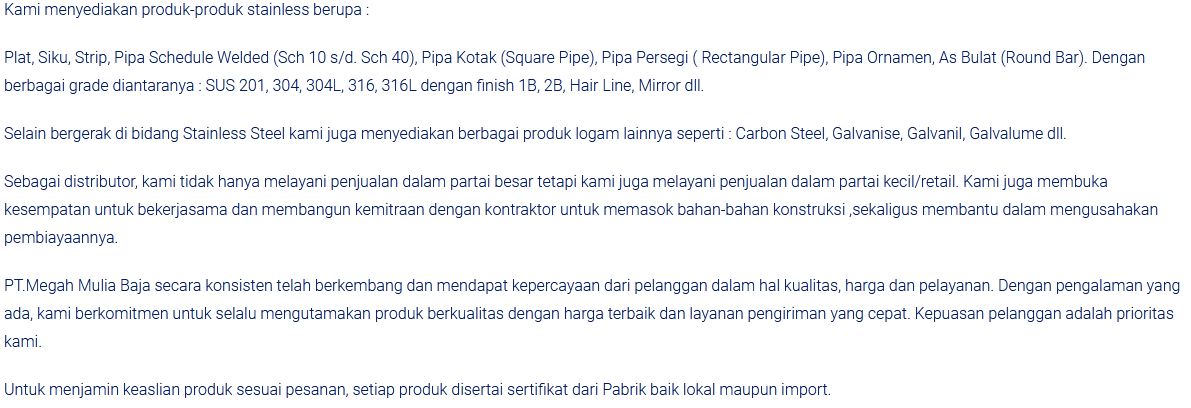 PT. Megah Mulia Baja Merupakan Perusahaan yang bergerak di bidang logam khususnya Stainless Steel, berlokasi dijakarta barat.