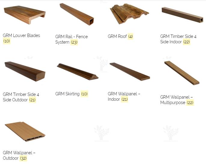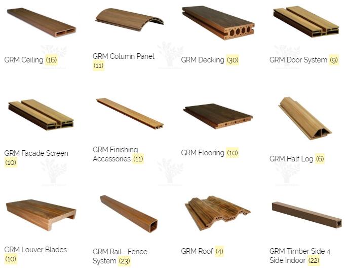 GRM Ceiling; GRM Column Panel ; GRM Decking; GRM Door System; GRM Facade Screen; GRM Finishing Accessories; GRM Flooring; GRM Half Log; GRM Louver Blades; GRM Rail - Fence System; GRM Roof ; GRM Skirting; GRM Timber Side 4 Side Indoor; GRM Timber Side 4 Side Outdoor; GRM Wallpanel ¨C Indoor; GRM Wallpanel ¨C Multipurpose; GRM Wallpanel ¨C Outdoor.
