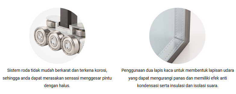 sebagai partisi halaman atau partisi tempat kolam renang.Berbeda dengan pintu lipat lain, pintu lipat EZ FOLDING menggunakan material terbaik dengan standarisasi kualitas produksi unggul, cepat dan stabil, yang membuat EZ FOLDING menjadi folding door terbaik di Korea. Penggerak pintu lipat menggunakan sistem roda terbaik dengan kualitas premium. Terbuat dari stainless steel dan dilapisi alumunium yang memiliki keunggulan anti karat sehingga tidak mudah korosi dan membuatnya dapat bergerak dengan sangat halus dibandingkan sistem roda produk lain. Roda pintu lipat EZ FOLDING mampu menahan beban sampai 500 kg. Material alumunium yang dipakai EZ FOLDING merupakan alumunium terbaik. Kadar beratnya melebihi alumunium pintu lipat kebanyakan. Pintu lipat EZ FOLDING dilengkapi dengan mohair yang membantu pergerakan pintu lipat menjadi lebih lancar. Fungsi dari mohair sebagai penyaring udara, debu, bahkan binatang kecil sekalipun. Dilapisi dengan film PP yang tahan air dan sinar ultraviolet. Gasket yang digunakan berbahan karet EPDM yang sudah terkenal dengan sifatnya yang awet, tahan terhadap uap, air dan oksigen sehinga mampu memberikan ketahanan maksimal terhadap angin, air dan suara. Dapat bertahan dengan kisaran suhu -50 sampai 120 derajat, menjadikan pintu lipat EZ FOLDING cocok untuk penggunaan outdoor. Selain itu, kualitas gasket terbaik pada ruas pintu lipat EZ FOLDING sangat aman dan mampu melindungi jari dari cedera akibat terjepit pada ruas pintu lipat. 图片展示