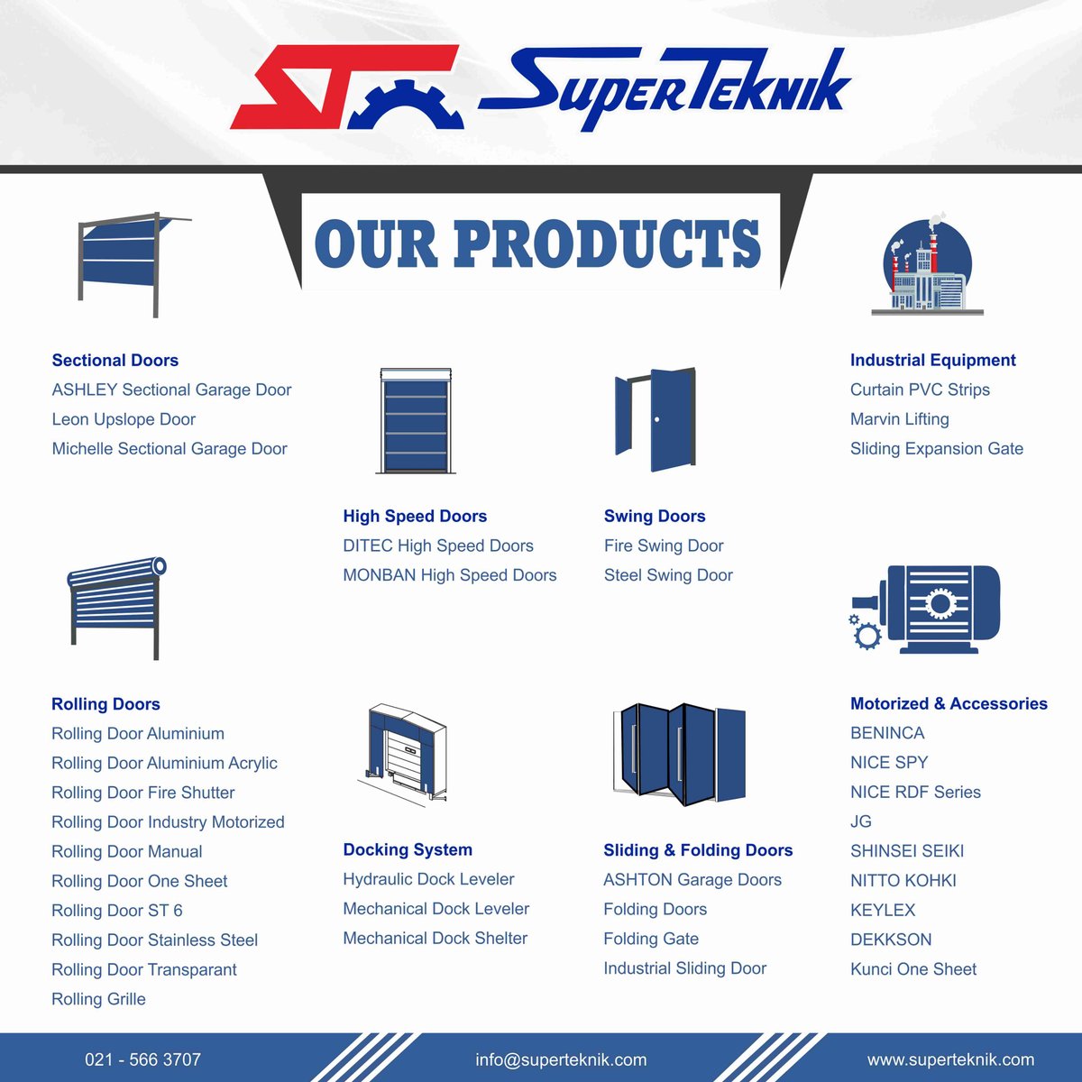 Super Teknik adalah satu dari perusahaan terbesar dalam manufaktur dan perakitan semua jenis pintu besi sejak 1986. Dengan variasi dan pengembangan produk yang sangat luas, serta di dukung dengan kualitas dan service yang prima membuat kami siap bersaing di pasar global. Produk kami sudah digunakan di berbagai lokasi residential, commercial, & industrial / pergudangan.