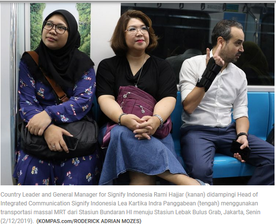 Terima kasih sudah mengajak saya menikmati perjalanan singkat dengan MRT Jakarta. Sangat mengesankan, infrastruktur yang membawa Jakarta menjadi metropolitan modern, maju, dan berdaya saing". Demikian Country Leader and General Manager for Signify Indonesia Rami Hajjar mengungkapkan kesannya usai menggunakan MRT Jakarta dengan titik awal Stasiun Lebak Bulus, di Jakarta Selatan, menuju titik akhir, Stasiun Bundaran HI, di Jakarta Pusat, Selasa (2/12/2019). Perjalanan singkat yang ditempuh kurang dari 40 menit itu, betul-betul membawa kesan khusus bagi Rami. "Terus terang, ini kali pertama saya mencoba MRT Jakarta. Dengan pengalaman yang begitu impresif, saya akan mengajak keluarga untuk menggunakan MRT," imbuh Rami dalam perbincangan eksklusif.