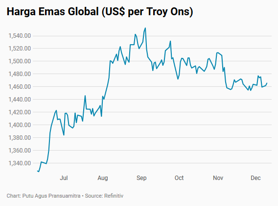 diperdagangkan di level US$ 1,465,73/troy ons, menguat 0,25% di pasar spot, melansir data Refinitv.