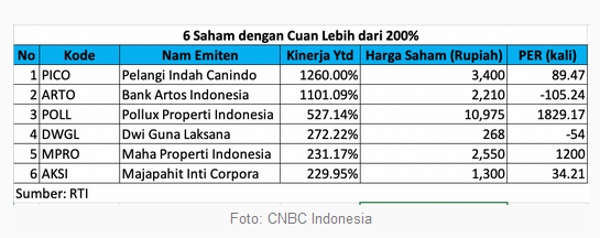 Data BEI mencatat, ada 6 saham yang mengalami kenaikan lebih dari 200%. Saham PT Pelangi Indah Canindo Tbk (PICO) naik 1.260% ke level Rp 3.400/saham. Namun price to earning ratio (PER) saham ini sudah mencapai 89,47 kali.