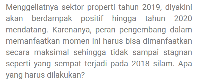 Menurut Ketua DPD Realestat Indonesia (REI) Bali, Pande Agus Permana, meski peningkatan sektor properti dan konstruksi tahun 2019 tidak terlalu besar, tetap harus disikapi dengan bijaksana, mengingat daya beli masyarakat memang sedang menurun. Hanya kondisi ini terbantu dengan adanya program pemerintah yang bertujuan agar masyarakatnya maju dan mandiri dengan memiliki hunian pribadi yang layak huni serta terjangkau.