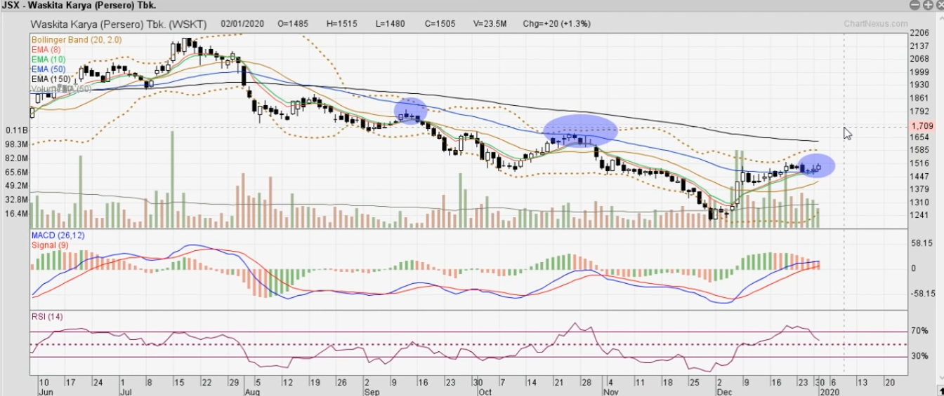 Saham Waskita Ditutup pada 02 Januari 2020 naik ke harga 1.505 bisa diperhatikan gambar dibawah ini Saham Ema diatas 50 telah terlewati. Bisa dilihat kembali Saham Waskita Karya Persero Tbk mengalami kenaikan di 2 minggu terakhir.