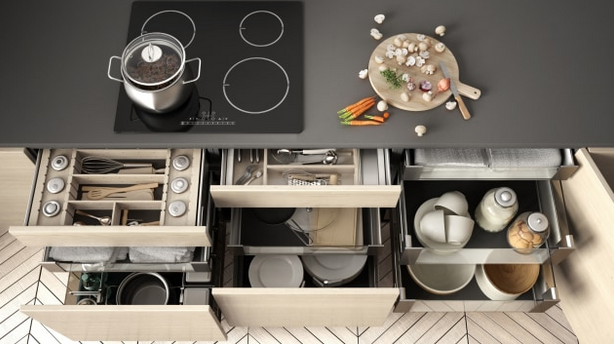 Salah satu tips terpenting yang perlu kita ikuti adalah dengan memaksimalkan ruang penyimpanan di dapur. Alih-alih meletakkan atau menggantung alat masak yang tak digunakan di ruangan dapur, Anda bisa memasukkannya ke dalam lemari agar dapur terlihat lebih luas dan bersih. Selain itu, Anda juga bisa menggunakan wadah atau pembatas lainnya dalam laci dan lemari, agar ada lebih banyak barang yang bisa disimpan secara teratur dalam lemari.
