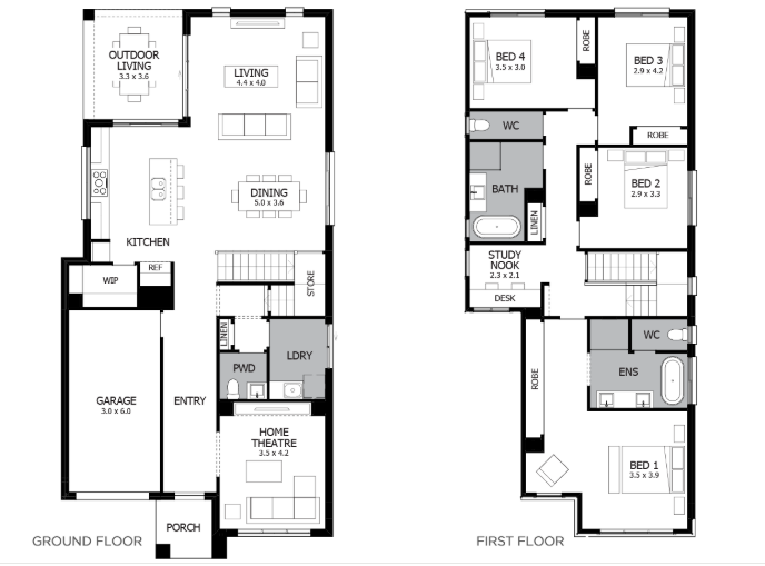 Sementara, lantai dasar pada denah rumah dua lantai ini lebih difokuskan untuk ruang-ruang utama. Uniknya, denah rumah dua lantai ini memiliki area lounge yang bisa difungsikan untuk menerima tamu sekaligus bersantai atau nongkrong bersama keluarga. Untuk bagian belakang denah rumah dua lantai ini dikhususkan untuk kegiatan makan.