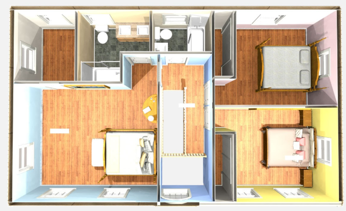 Bukan tidak mungkin bagi rumah mungil untuk menggunakan denah rumah dua lantai agar tampil maksimal. Melalui pengaplikasian denah rumah dua lantai pada rumah mungil di atas, terlihat ada empat kamar tidur, di mana semuanya ditempatkan pada lantai atas. Masih di lantai yang sama, terdapat dua kamar mandi yang masing-masing dilengkapi dengan closet duduk, wastafel, dan bak mandi.