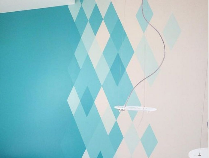 Jika sebelumnya ada pola zigzag, cat dinding biru tosca yang selanjutnya ini bermotif diamond. Meskipun terlihat sederhana, tapi cat dinding biru tosca ini juga memberikan kesan mewah, lho! Untuk warnanya sendiri setidaknya terdiri dari empat tingkatan warna biru tosca dan warna putih.