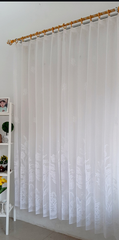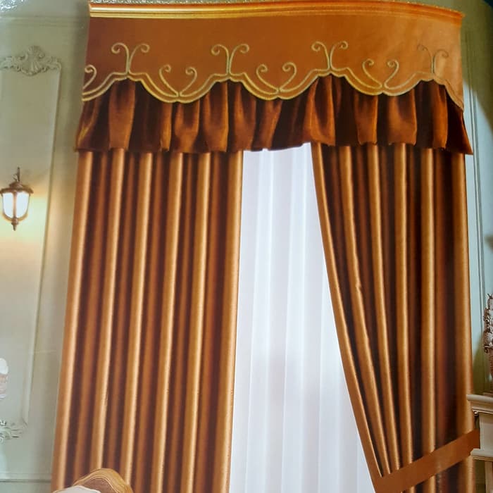 Ini adalah model gorden full set, yaitu terdiri dari panel pair (dua gorden) dan valance (kelambu penutup yang terletak di sisi atas). Model ini cocok untuk digunakan rumah klasik yang penuh dengan detail dan ukiran.