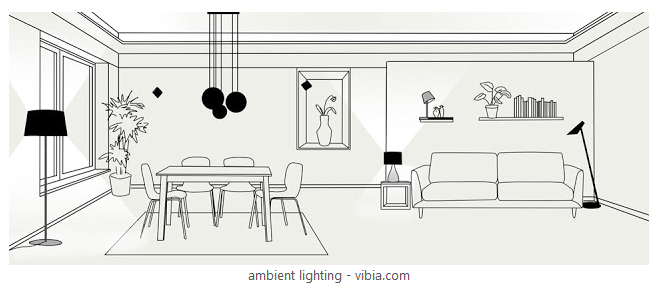 Pencahayaan ambient light memberikan pencahayaan keseluruhan dan dimaksudkan untuk menciptakan tingkat pencahayaan umum dan seragam pada ruangan. Ini adalah lapisan pertama sistem pencahayaan dan mengatur nada ruang. Itulah sebabnya biasanya lampu untuk ambient light memiliki sifat cahaya yang lunak atau menyebar, dan sering kali dapat disesuaikan untuk mengakomodasi pengaturan siang dan malam hari.