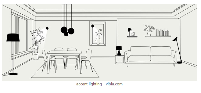 Lampu aksen biasanya tiga kali lebih terang dari cahaya sekitar. Pencahayaan aksen menarik perhatian pada beragam elemen atau fitur dalam ruangan, seperti karya seni, perabotan, atau detail arsitektur, mengubahnya menjadi titik fokus. Fitting yang fleksibel lebih disukai untuk jenis pencahayaan ini, karena memungkinkan mengubah posisi fokus pada area atau objek kecil.