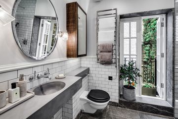 Styling kamar mandi aesthetic ini termasuk sangat gampang untuk diterapkan. Kuncinya ada pada rak dinding sebagai dekorasi dan storage multifungsi. Yang juga unik pada kamar mandi aesthetic ini adalah furnitur kayu yang lebih bersifat sebagai aksesoris ruangan. Namun, dengan kehadirannya, kamar mandi aesthetic terasa lebih chill dengan solusi space-saving ekstra. Tertarik menerapkan desain yang satu ini?