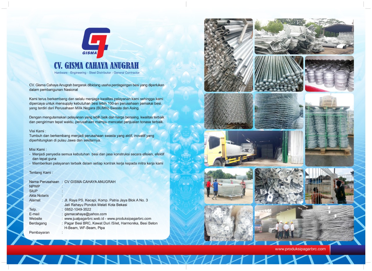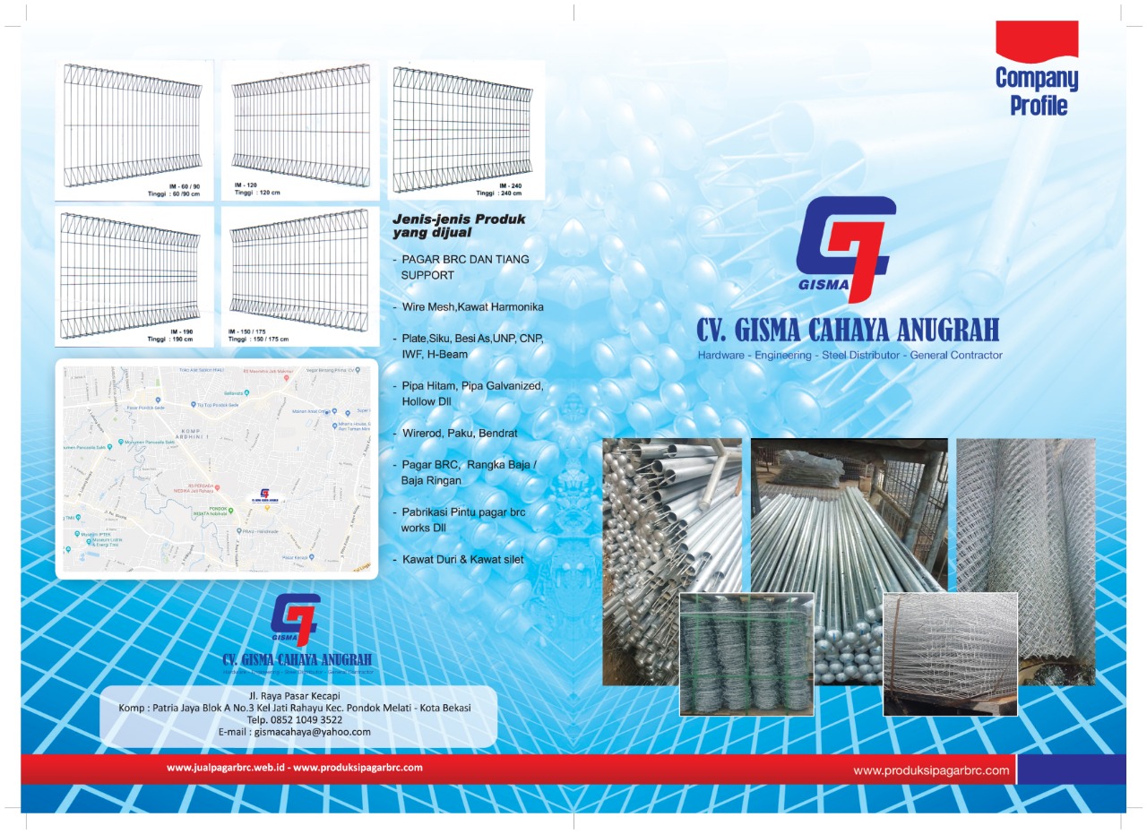 CV. Gisma Cahaya Anugrah, dalam memasarkan dan memasang pagar Brc yang didukung oleh beberapa pabrik pembuat pagar BRC se jabodetabek,dan mempunyai mitra jasa tenaga ahli pemasangan serta pabrikasi dan modifikasi. Ada dua bagian pagar BRC yang secara umum.